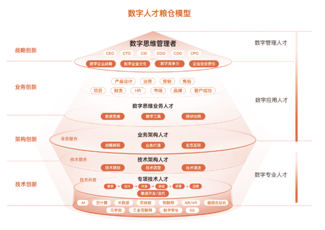 但是,不论是数字经济还是企业数字化转型,背后的动力源都是数字人才培养。五层数字人才粮仓模型的拆解,就是帮助企业分析需要哪些人才,人才需要具备哪些能力。有了这些概念,基于岗位梳理的岗位技能谱图建设方法论就能帮助企业把事情做扎实,各层次的培养方向和案例也才能更有效地启发和帮助到企业。