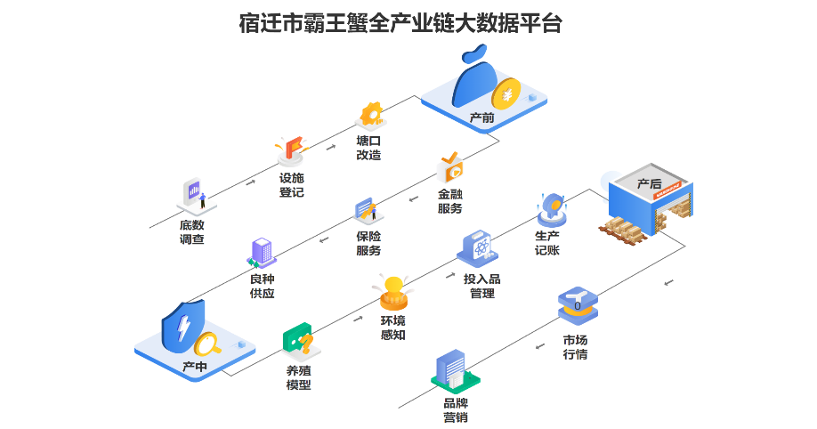 基于万物智联的源产地实时监测预警,对宿迁霸王蟹从生产环境、养殖过程、消费者溯源信息的整合,可视化感知霸王蟹养殖、产品溯源等动态数据。帮助养殖主体科学养殖,为企业生产赋能。