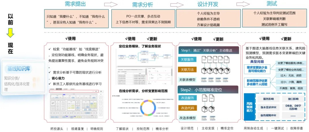 需求基线管理:构建统一的结构化知识结构模型,将知识结构化为业务流程、业务功能、业务活动、业务规则,并关联系统的服务及表模型,形成结构化基线存储模型,为需求知识的表达提供了坚实的数据结构基础。